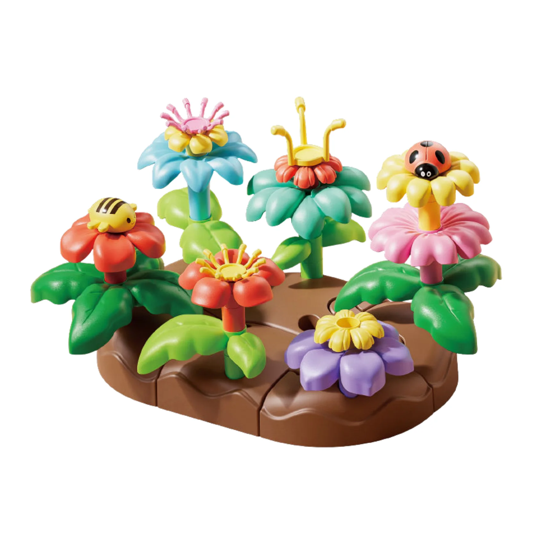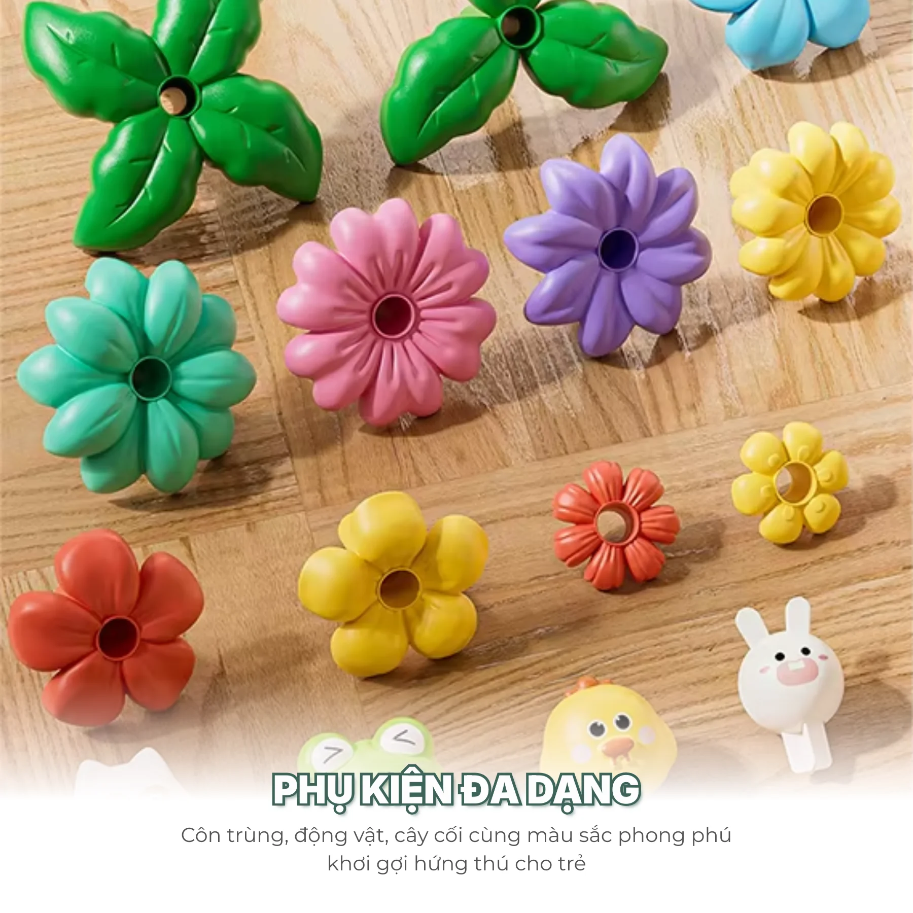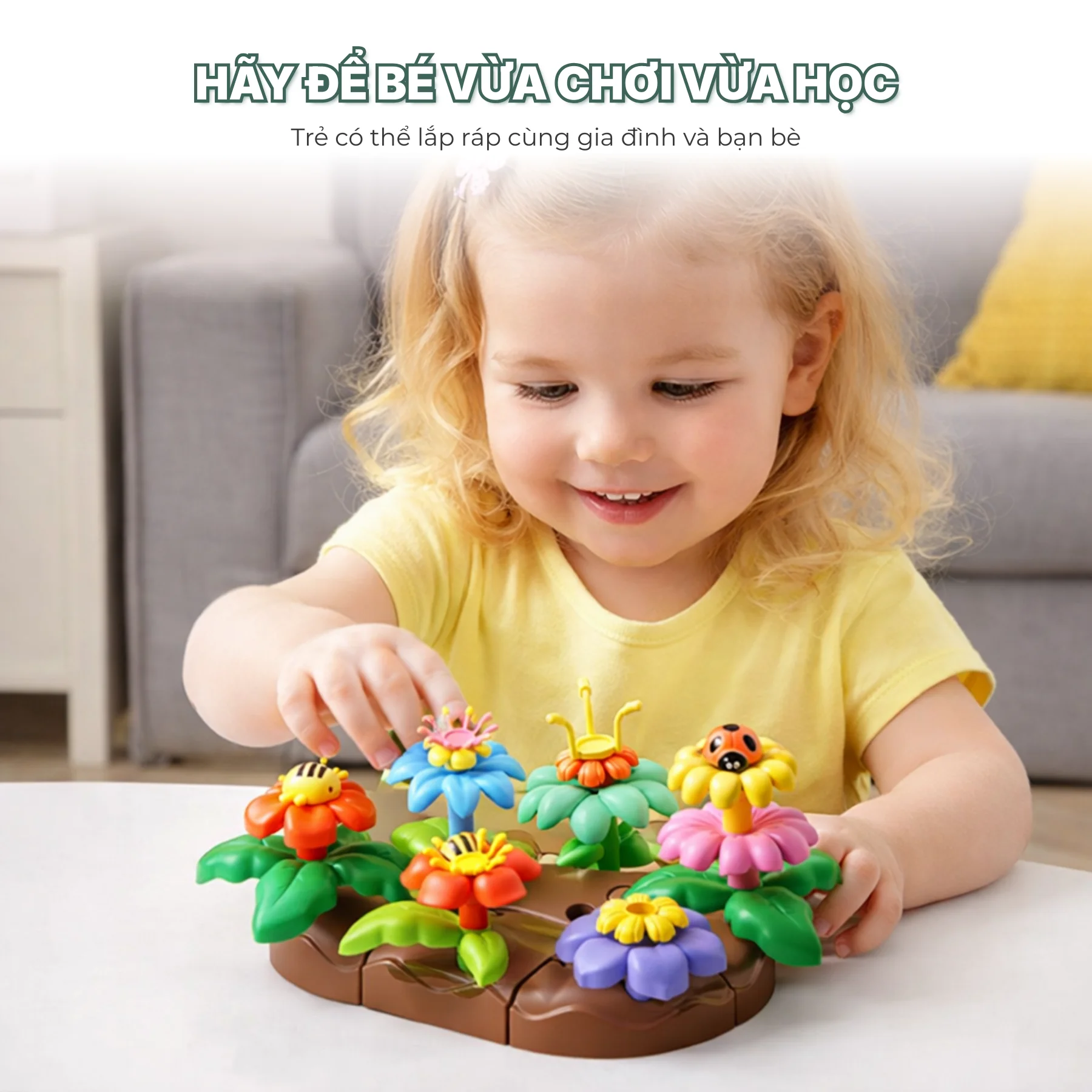 Bộ lắp ráp tái hiện một khu vườn hoa nhỏ với nhiều loại hoa khác nhau. Mỗi bông hoa được thiết kế với hình dáng và màu sắc riêng, giúp bé nhận biết màu sắc và hình dạng trong quá trình vui chơi.