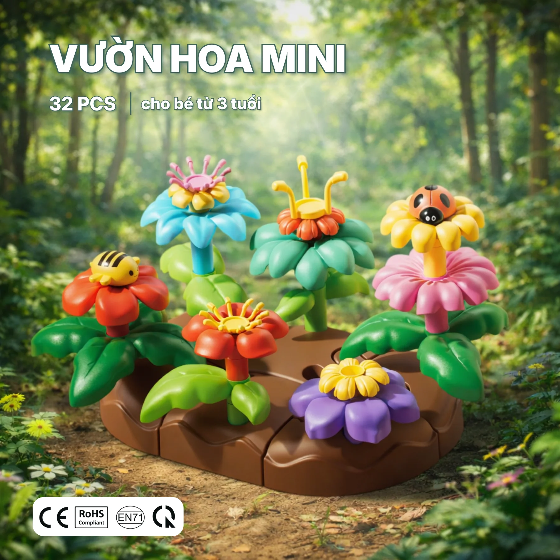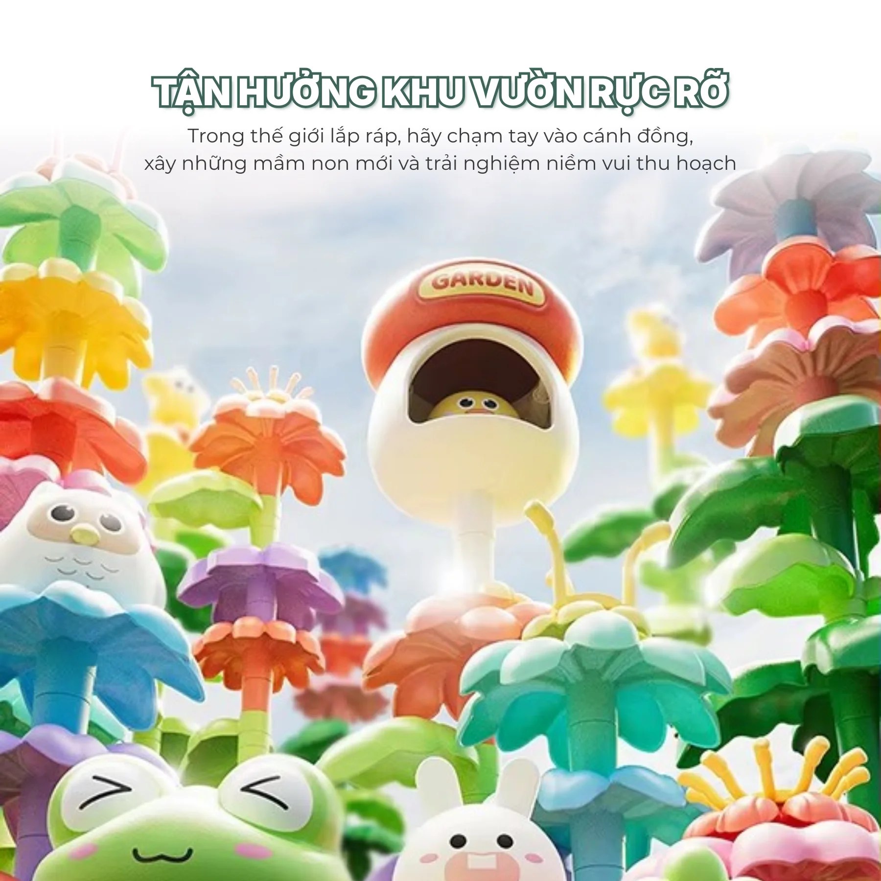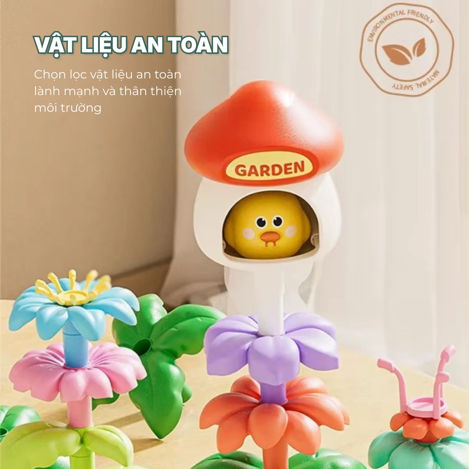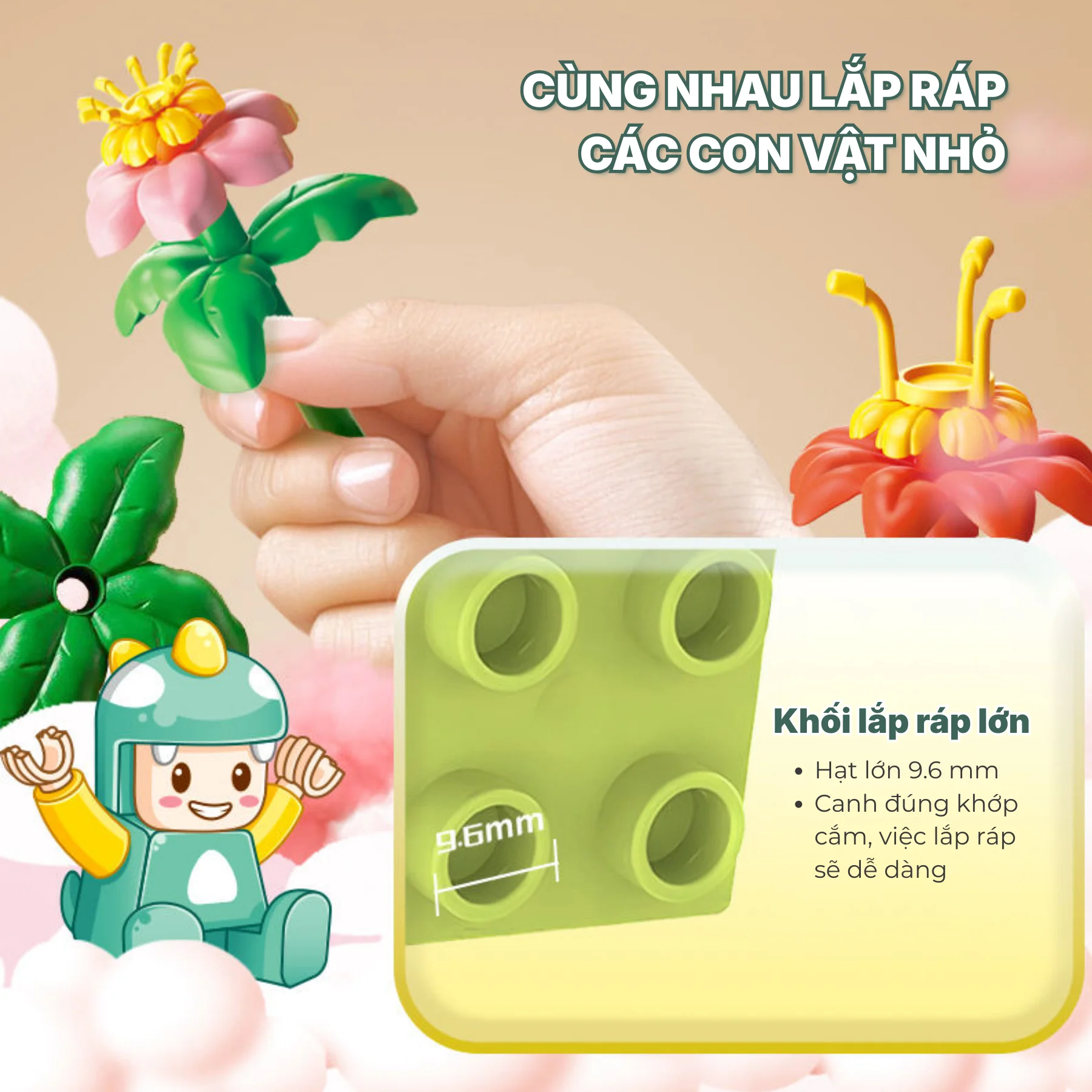 Bộ lắp ráp tái hiện một khu vườn hoa nhỏ với nhiều loại hoa khác nhau. Mỗi bông hoa được thiết kế với hình dáng và màu sắc riêng, giúp bé nhận biết màu sắc và hình dạng trong quá trình vui chơi.