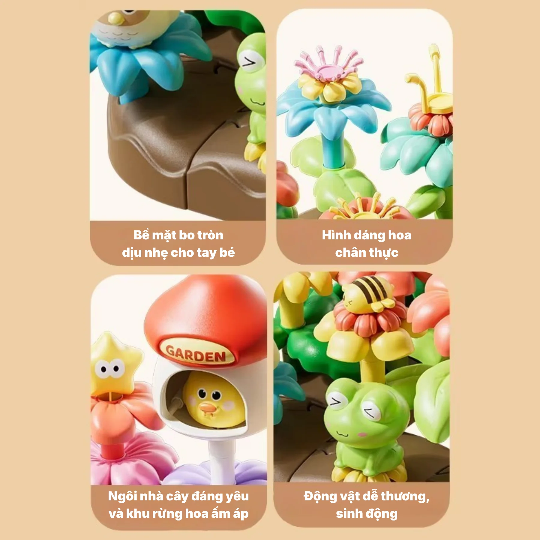 Các chi tiết của bộ đồ chơi được thiết kế để bé có thể lắp ráp theo nhiều cách khác nhau. Bé có thể thay đổi vị trí cành, lá và bông hoa để tạo ra những khu vườn mới theo trí tưởng tượng của mình.