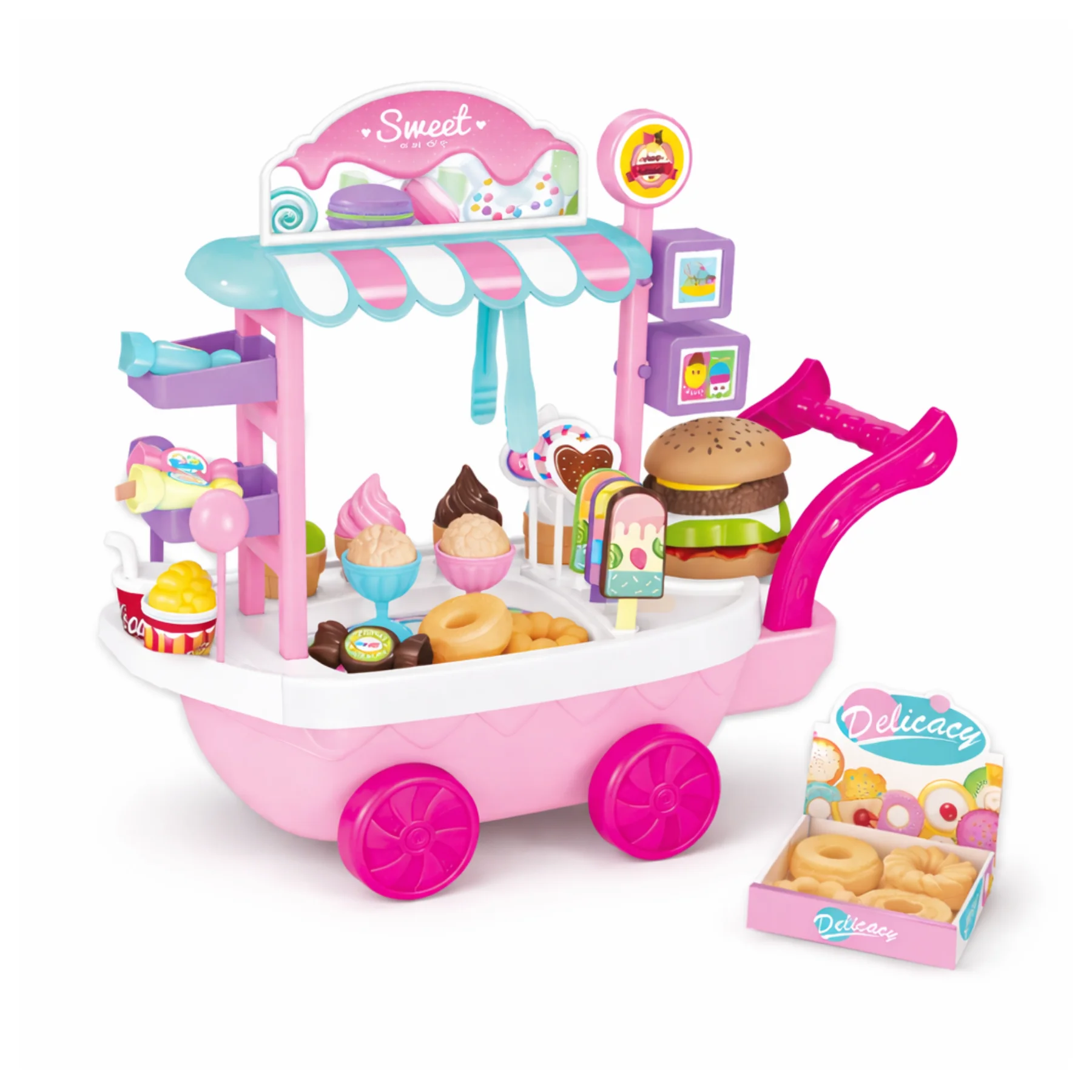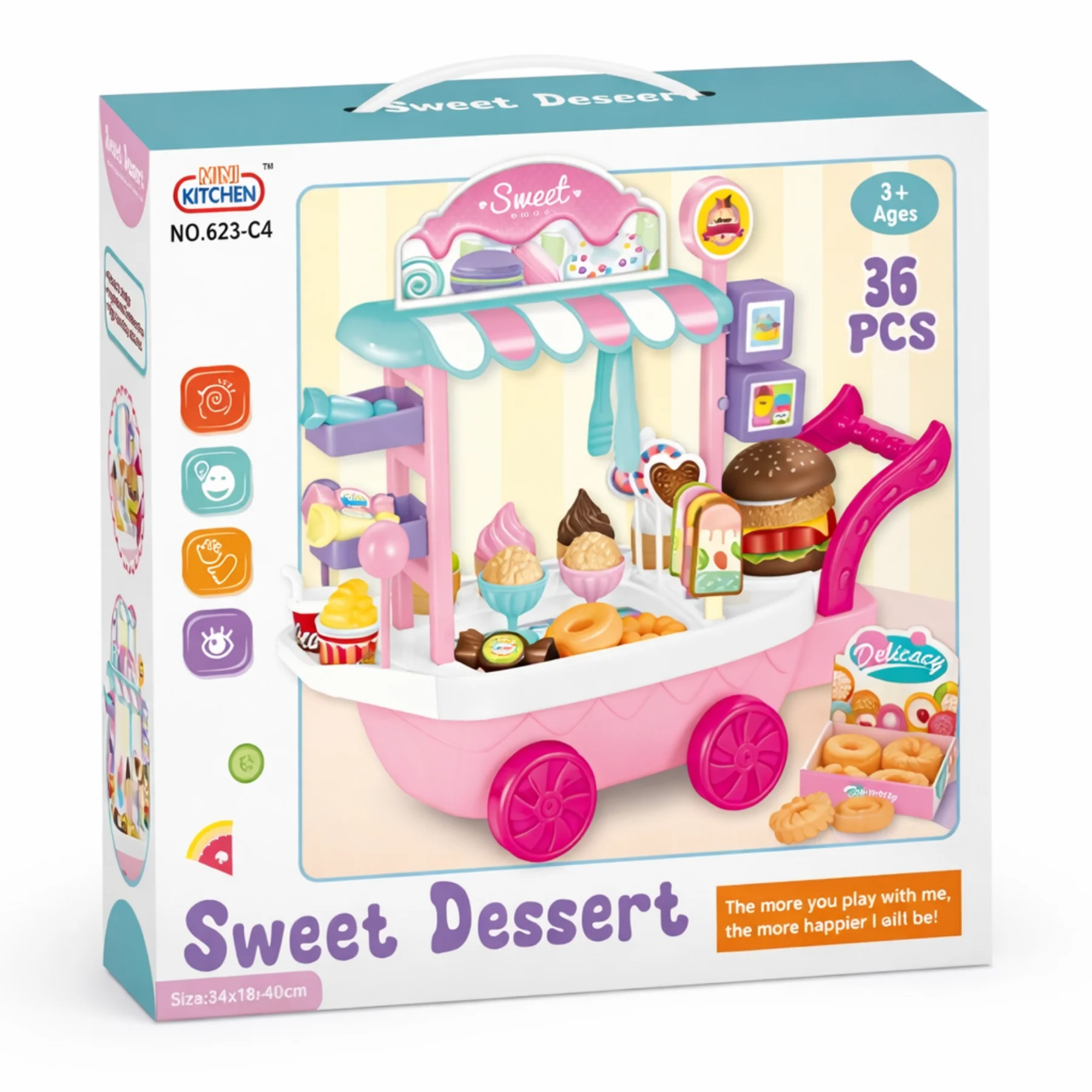 Xe bán đồ ngọt đồ chơi Mini Kitchen 623-C4 được thiết kế mô phỏng một xe bán bánh kẹo và kem lưu động đáng yêu, với tông màu pastel ngọt ngào, kiểu dáng sinh động, phù hợp cho bé từ 3 tuổi trở lên trong các trò chơi nhập vai bán hàng và sinh hoạt hằng ngày.