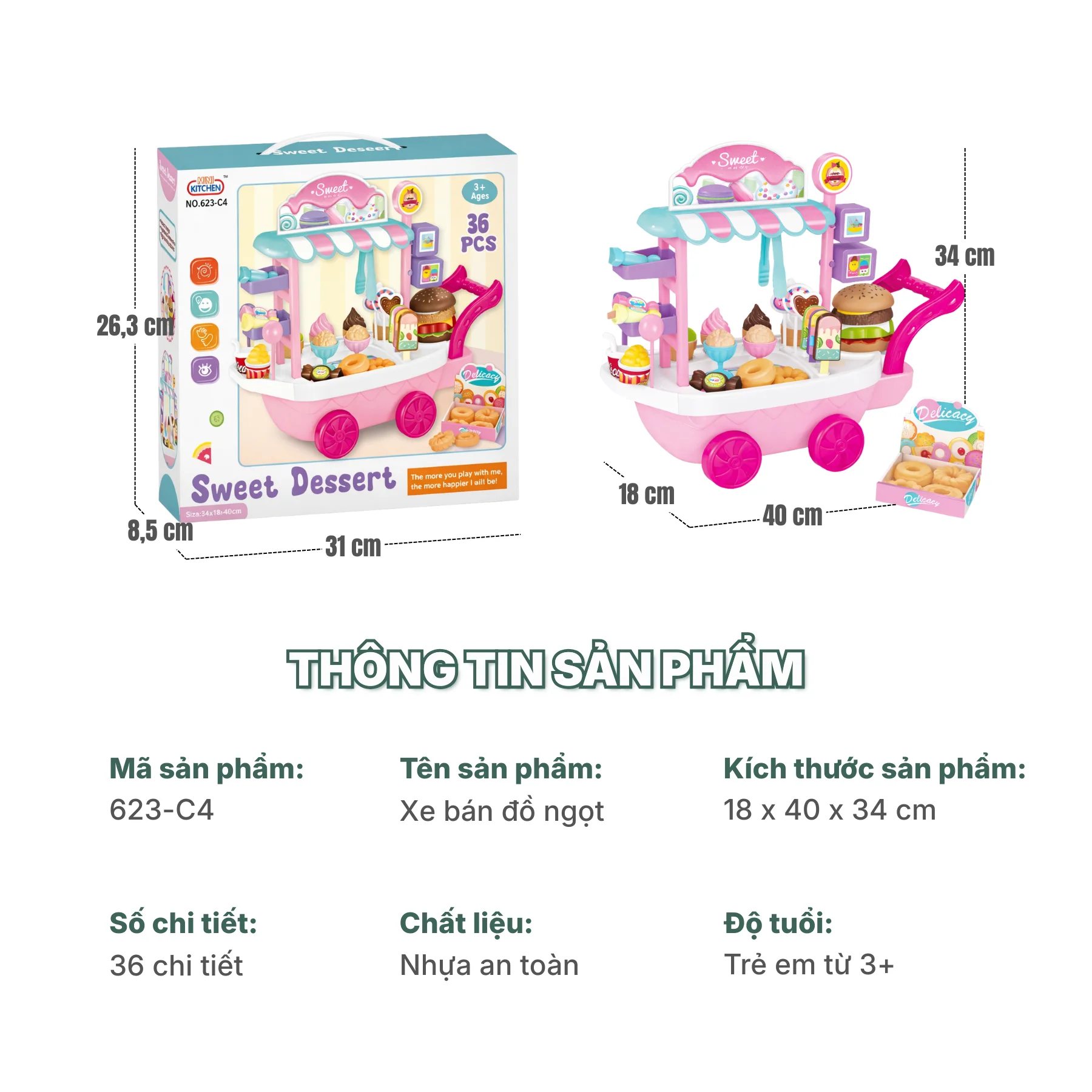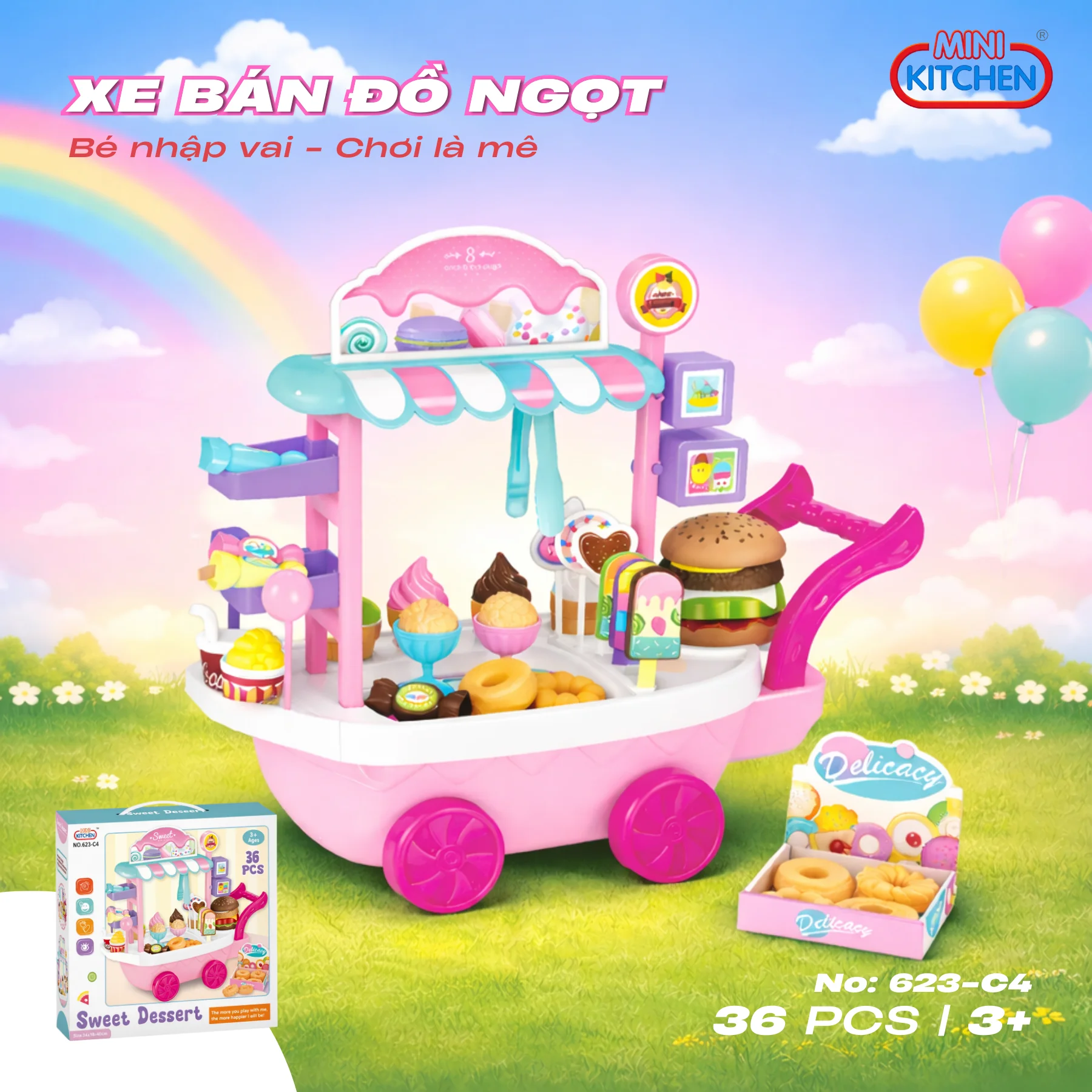 Xe bán đồ ngọt Mini Kitchen 623-C4 là món đồ chơi nhập vai lý tưởng giúp bé vừa chơi vui vừa học hỏi các kỹ năng sinh hoạt và giao tiếp hằng ngày một cách tự nhiên.