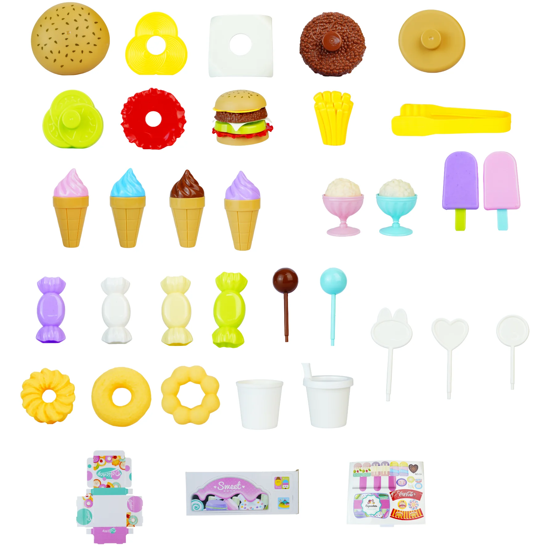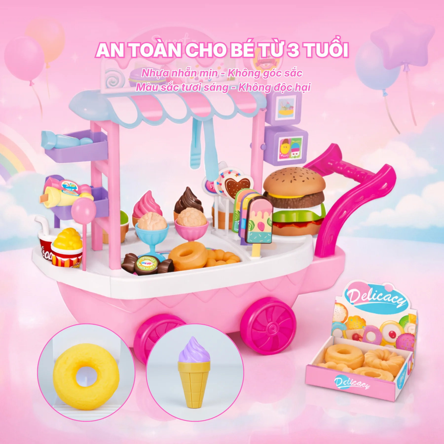Bộ xe đi kèm nhiều phụ kiện phong phú như kem ốc quế, kem ly, bánh donut, hamburger, kẹo, que kem và dụng cụ gắp, giúp bé thoải mái sáng tạo các tình huống bán hàng, phục vụ khách và trang trí quầy theo ý thích. Các chi tiết được thiết kế vừa tay trẻ nhỏ, dễ cầm nắm và thao tác.