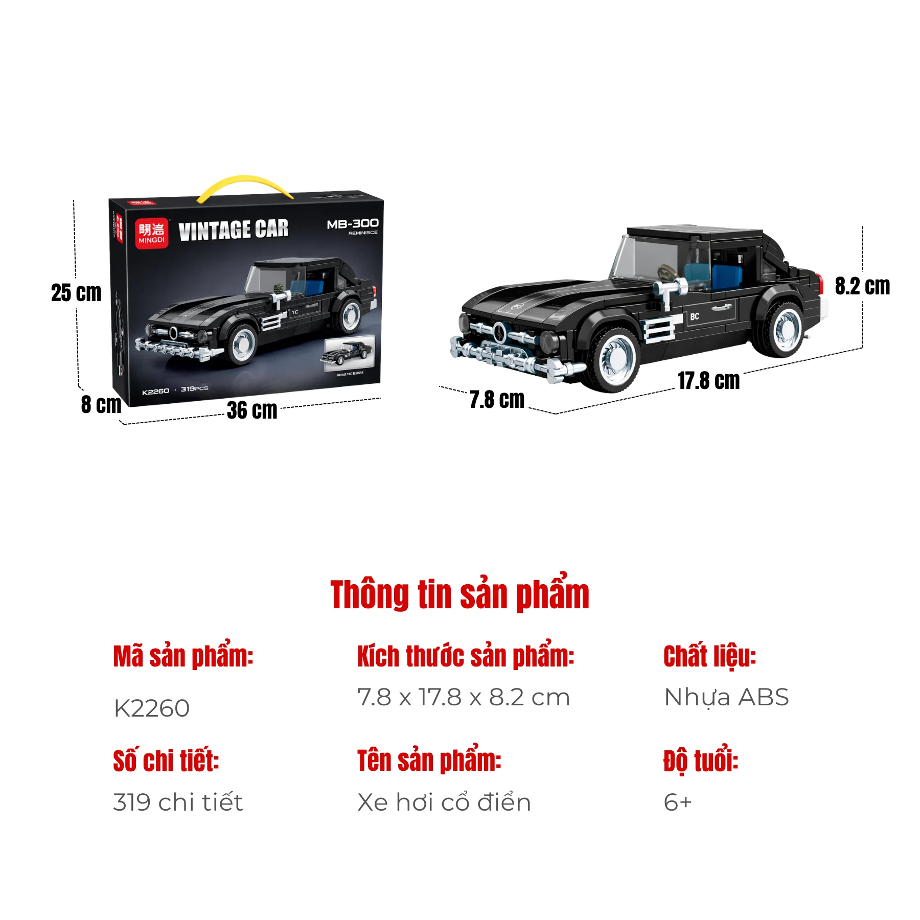 Bộ đồ chơi lắp ráp xe cổ điển MINGDI Vintage Car MB-300 K2260 là mô hình xe hơi mang phong cách cổ điển sang trọng với thiết kế tinh tế và nhiều chi tiết mô phỏng chân thực. Bộ mô hình gồm 319 chi tiết lắp ráp, cho phép người chơi tự tay xây dựng từng bộ phận để tạo nên một chiếc xe hoàn chỉnh.