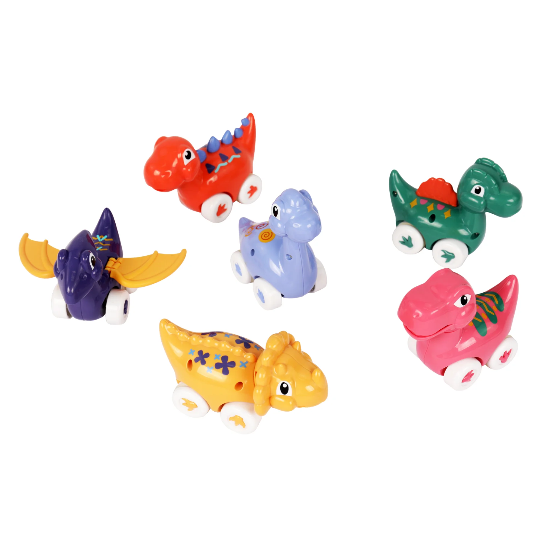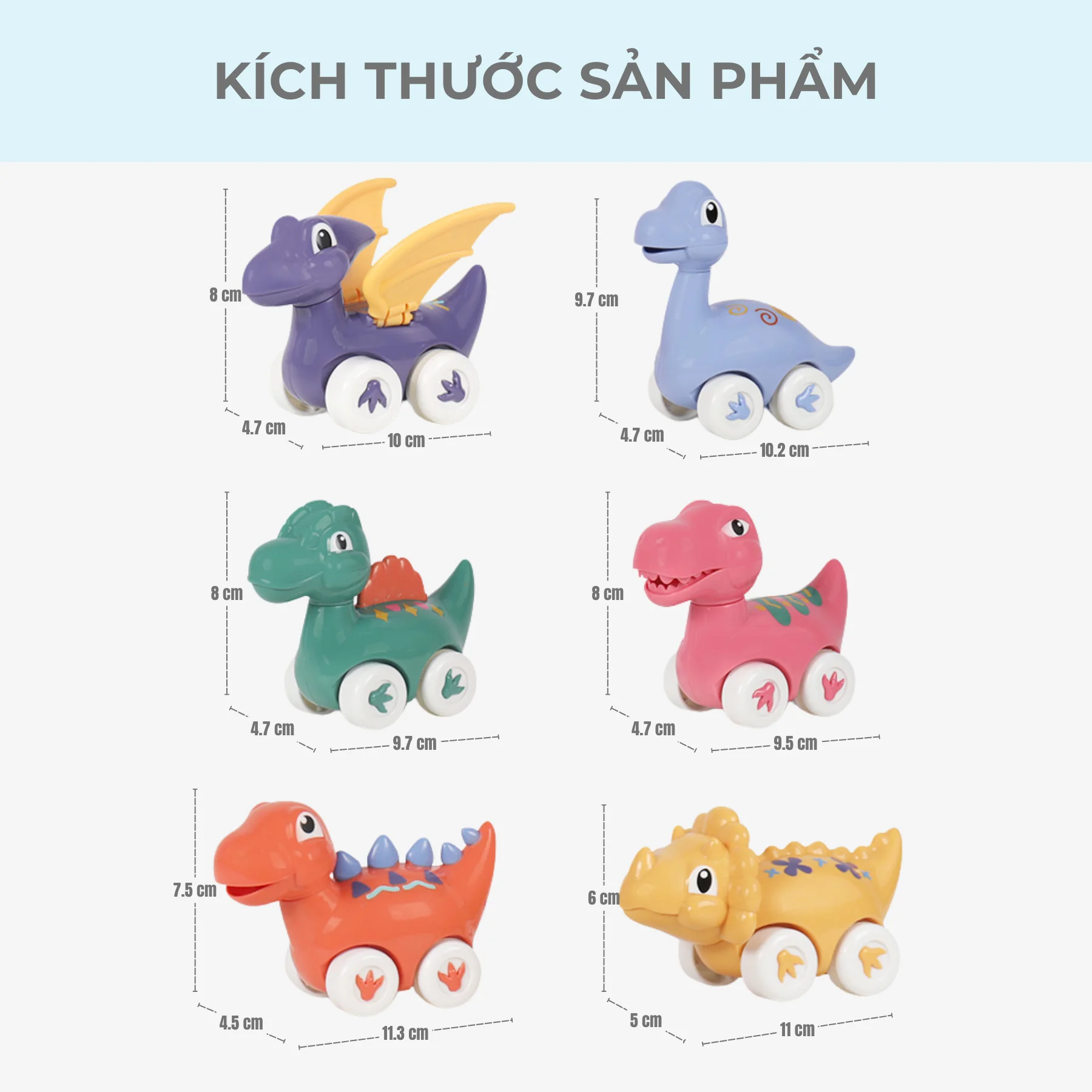 Bộ sản phẩm gồm 6 mẫu khủng long khác nhau với hình dáng và màu sắc bắt mắt. Mỗi mẫu khủng long đều được thiết kế theo phong cách hoạt hình dễ thương giúp thu hút sự chú ý của trẻ nhỏ.