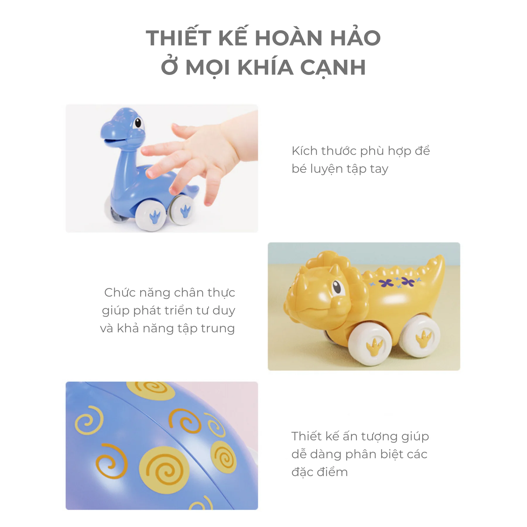 Thiết kế đáng yêu kết hợp cơ chế chuyển động đơn giản giúp bé vừa vui chơi vừa khám phá chuyển động, đồng thời phát triển khả năng vận động và trí tưởng tượng trong quá trình chơi.