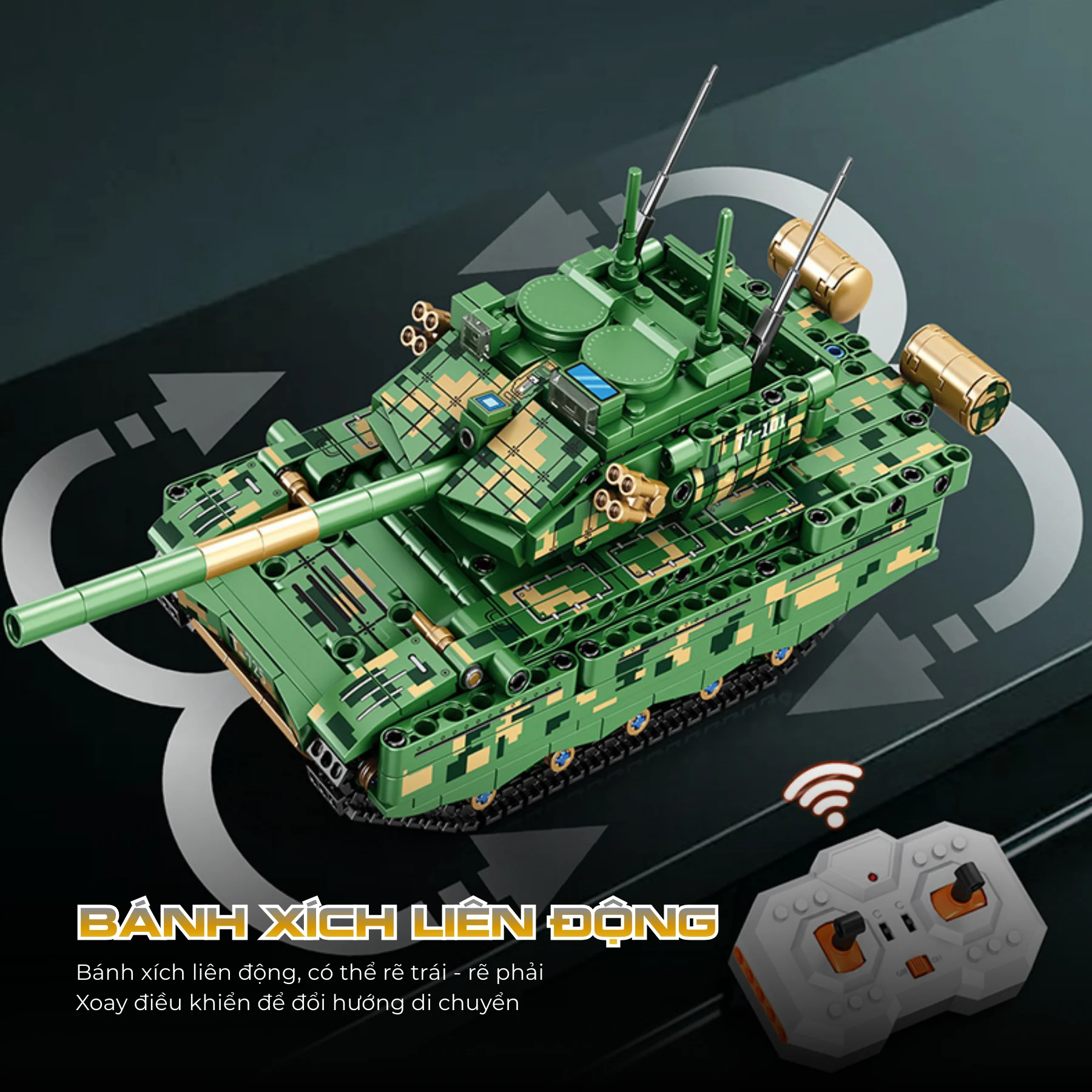 Xe được trang bị hệ thống điều khiển từ xa 2.4GHz, giúp người chơi có thể điều khiển xe tăng di chuyển linh hoạt.