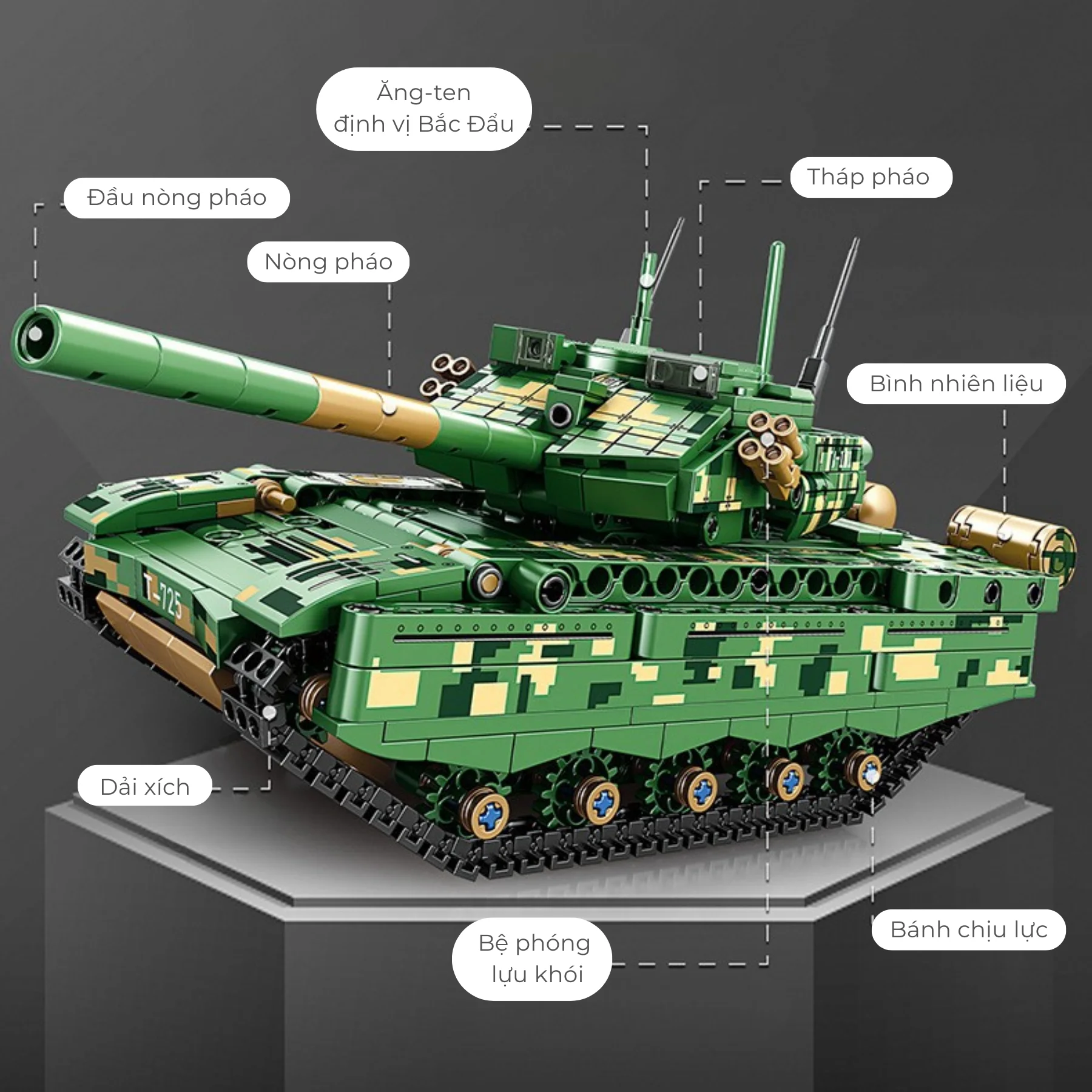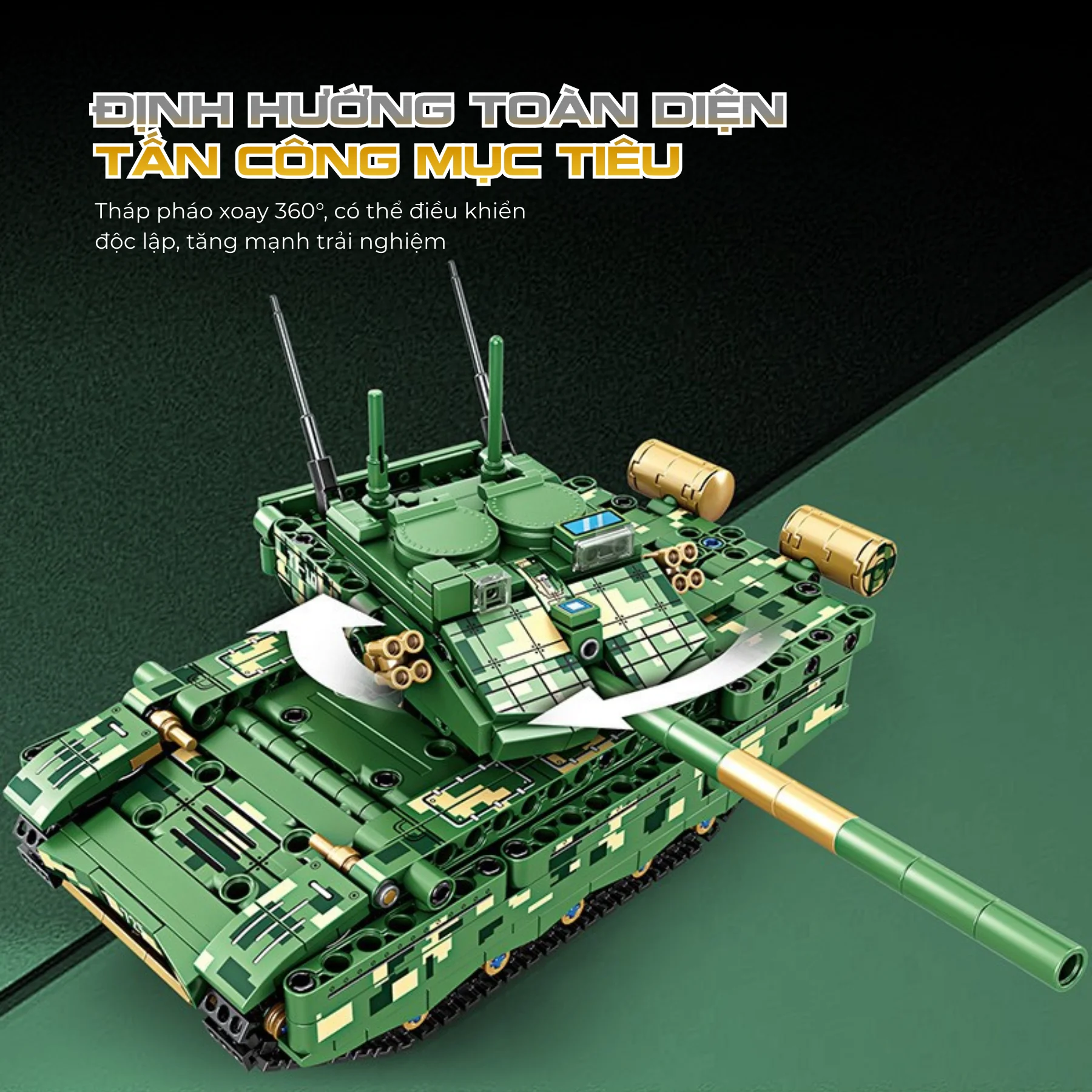 Mô hình xe tăng được thiết kế với tháp pháo có thể xoay 360 độ, cho phép điều chỉnh hướng bắn linh hoạt giống như xe tăng ngoài thực tế.