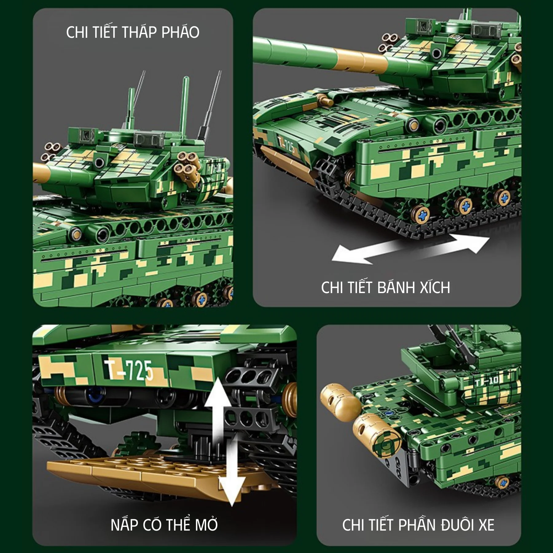Mô hình xe được thiết kế với tông màu xanh quân đội ngụy trang, tái hiện phong cách của các dòng xe tăng chiến đấu hiện đại. Phần thân xe được mô phỏng với nhiều chi tiết quân sự như: