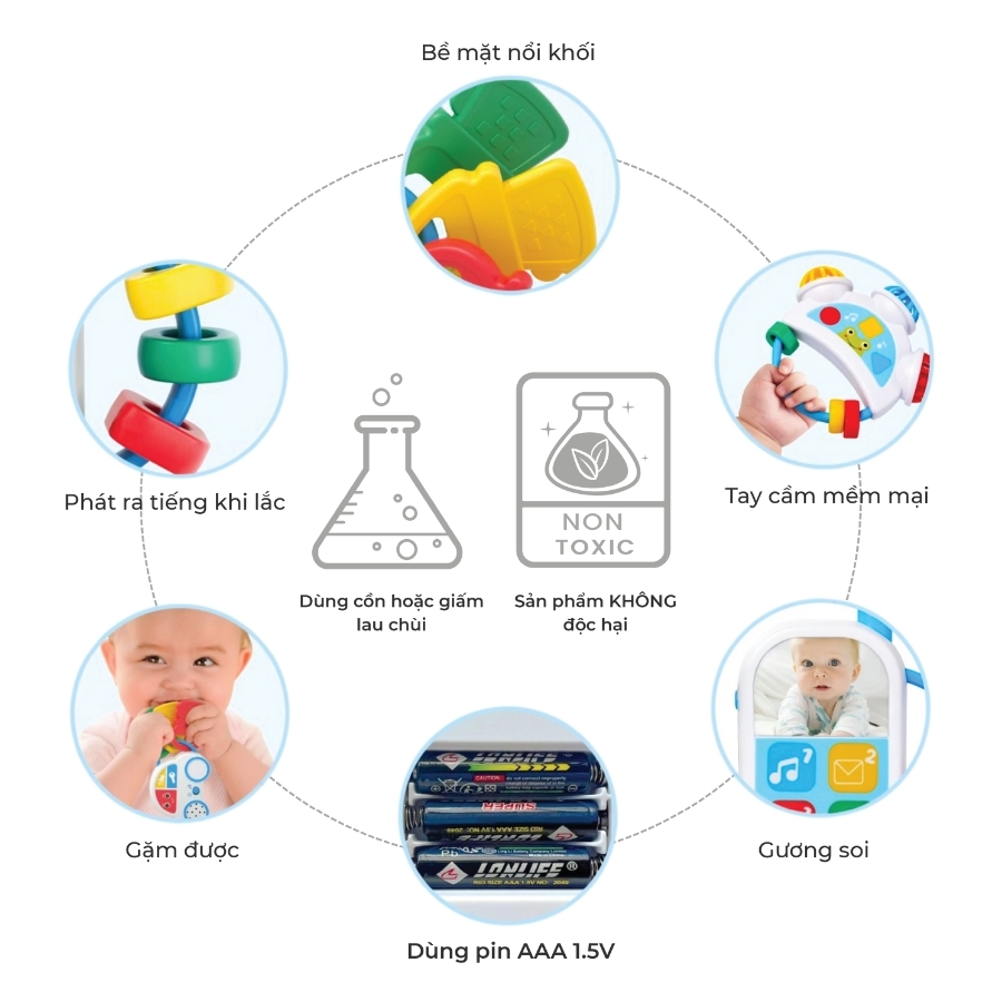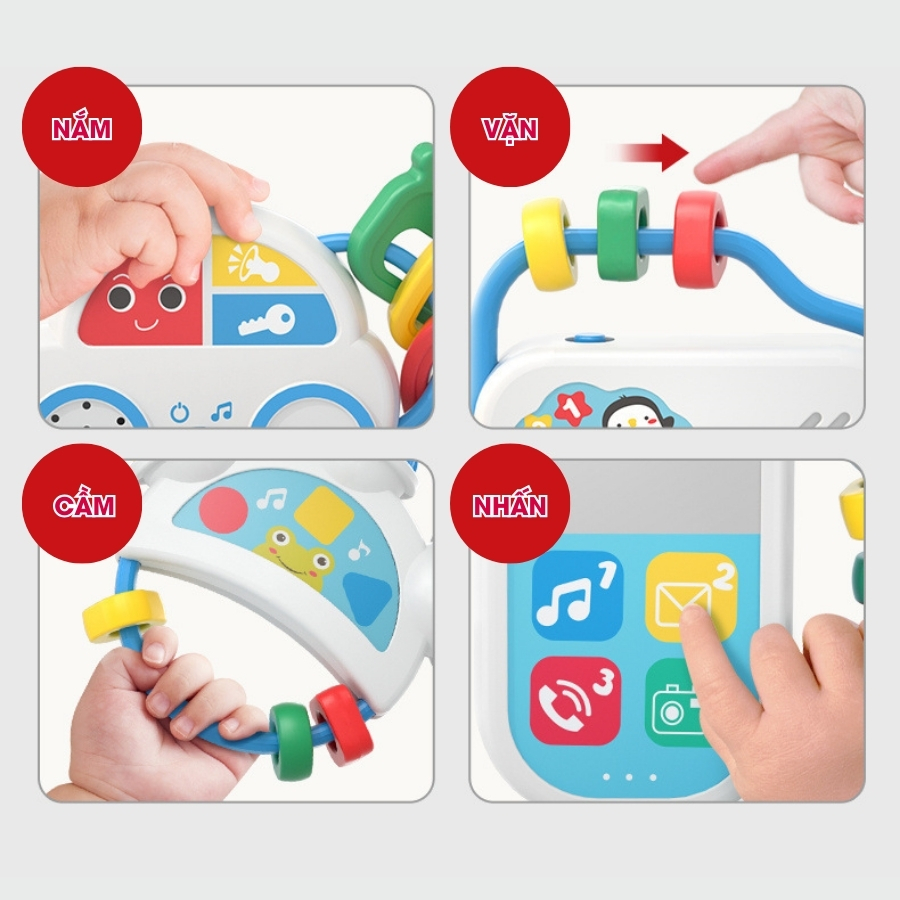 Giúp phát triển thính giác, xúc giác và khả năng cầm nắm. Màu sắc bắt mắt, kích thích tương tác