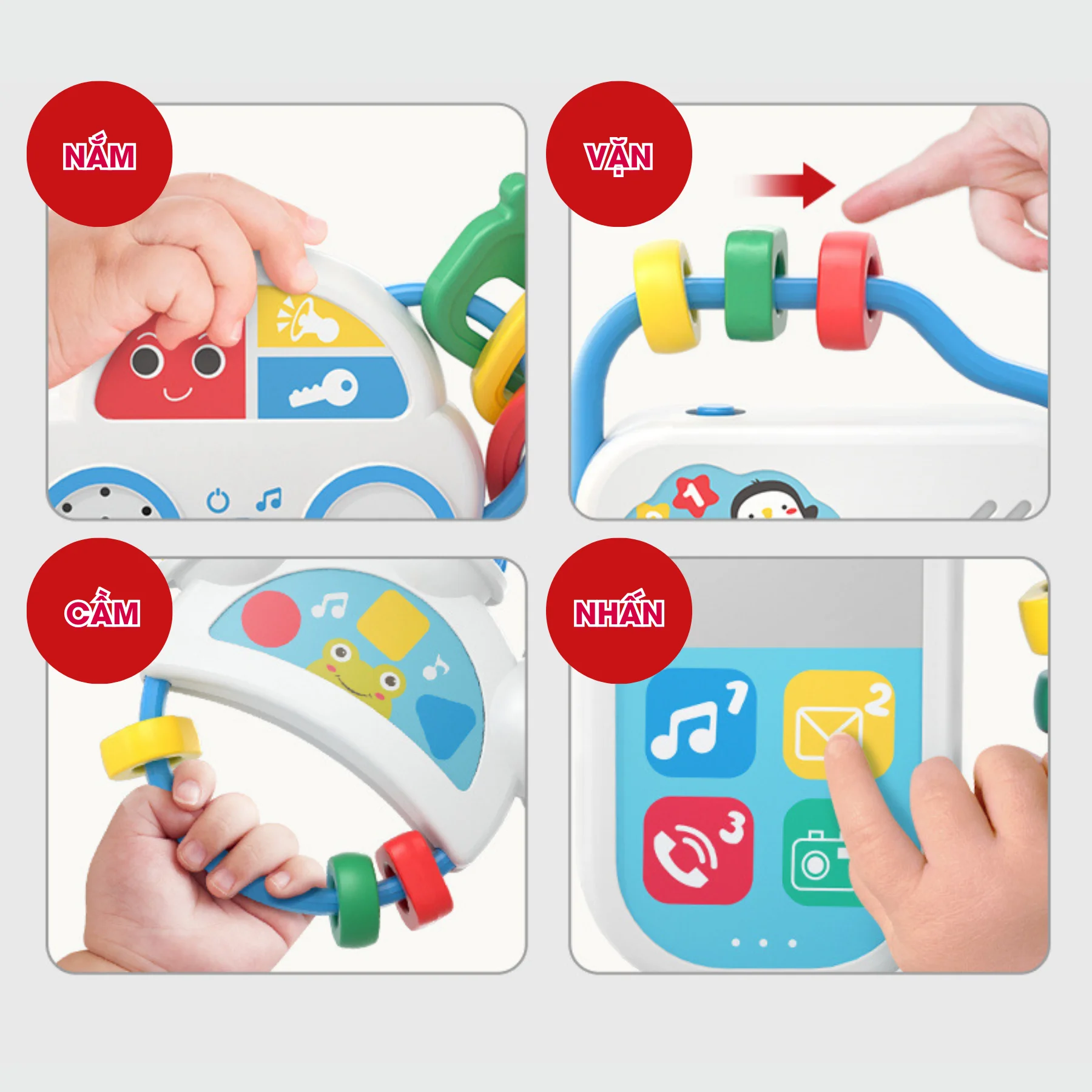 Đa chức năng trong 1 món đồ chơi: xúc xắc – nhạc cụ – gặm nướu – đồ cầm nắm.